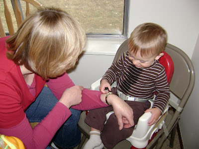 Another fascination of his is Noni's watch. This all started a few months ago when he would touch the watch that Noni always wears. She would say, "Noni's watch" and he loved seeing her lips move and hearing the words. Each time they see each other, Trip remembers to touch her watch and Noni says the magic words. A couple of visits ago, he touched her watch once when she wasn't paying attention and was looking at her very intently expecting a response. Another funny experience came when he was sitting in a friend's lap who was wearing a watch. Trip kept touching it and looking at her expecting her to know the game. So cute!